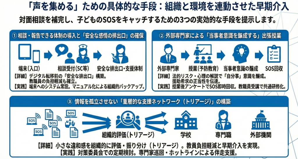 対面での相談を補完し、子どもの内面に潜む「SOS」を確実にキャッチするために、教育委員会と学校が優先して取り組むべき3つの実効的な手段を提示します。