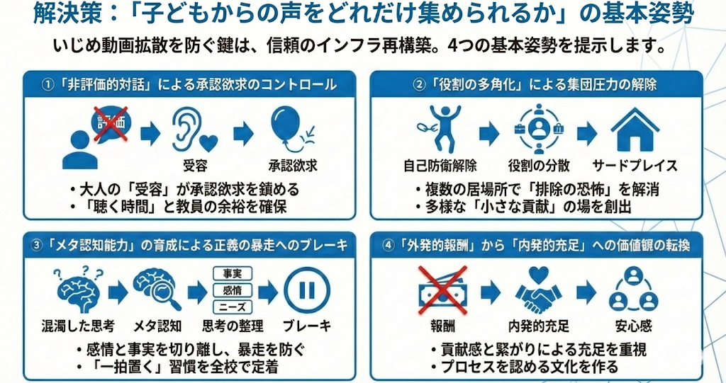 不適切な動画拡散いじめ動いじめ動画の拡散を防ぐには、外部ツールに頼り切る前に、まず「学校の先生や大人に相談すれば解決する・守ってもらえる」という信頼のインフラを再構築することにあります。上記(2)の拡散要因を組織的に解消するための基本姿勢を提示します。